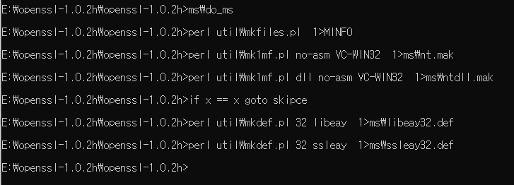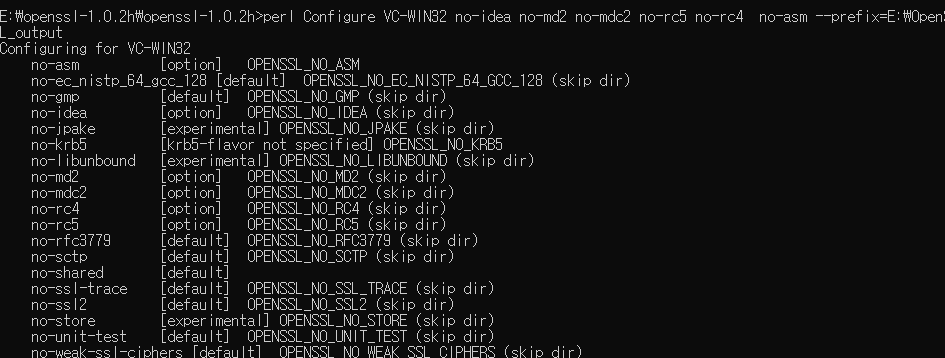 예시 : $perl Configure VC-WIN32 no-idea no-md2 no-mdc2 no-rc5 no-rc4 no-asm --prefix=E:\OpenSSL_output