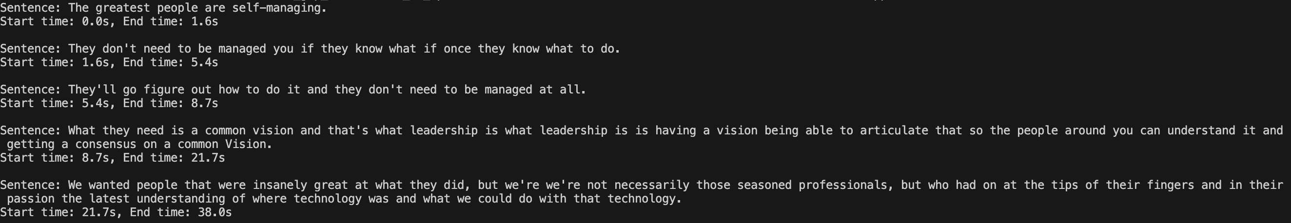 # Print the sentences with their timing