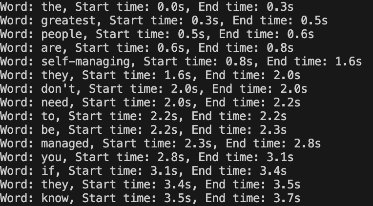 print(f"Word: {word}, Start time: {start_time}s, End time: {end_time}s")