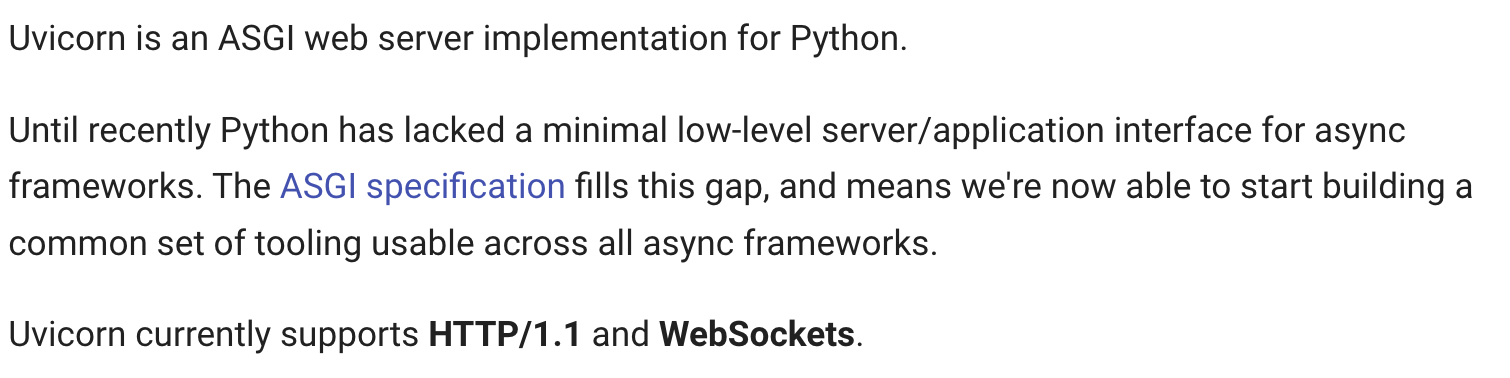 * 필요한 라이브러리 중 대표적인 것이 unicorn (https://www.uvicorn.org/)