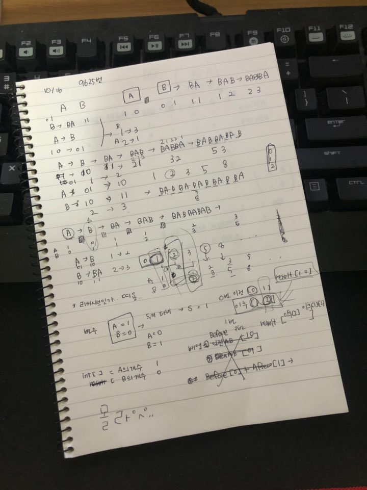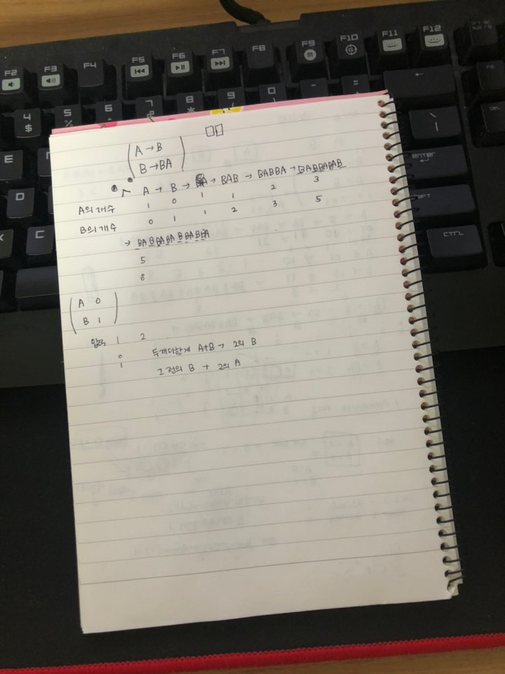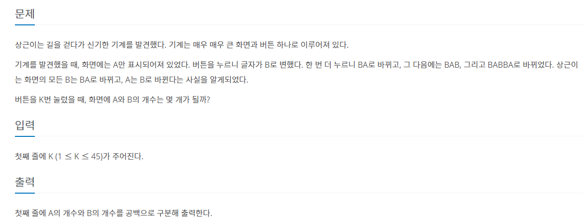 이전의 A개수 + B의 개수가 다음의 B의 개수가 되고, 이전의 B의 개수가 다음의 A의 개수가 된다.