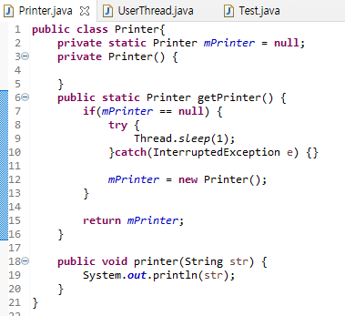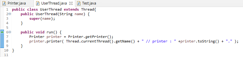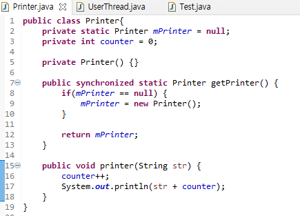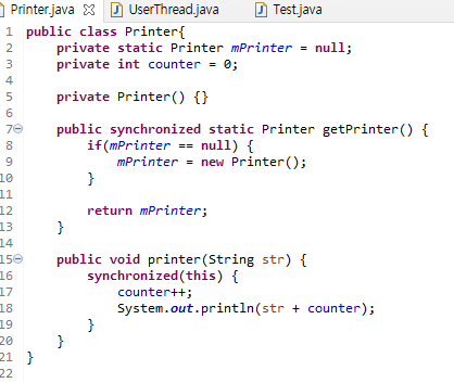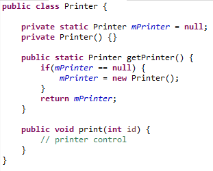 하지만 위의 소스처럼 구현을 하게되면, "public"으로 되어 있기 때문에 접근하는 사용자마다 PrinterManager 객체를 생성하게 되고 그럼 총 8개의 PrinterManager 객체가 생성되어 하나의 Printer를 관리하는 것이 아니게 된다.