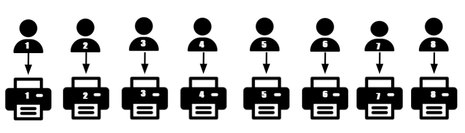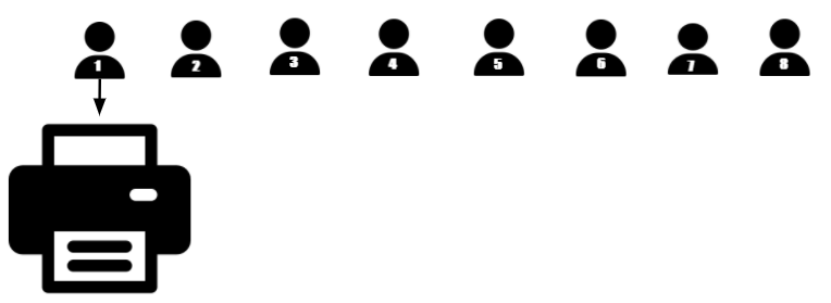 궁극적으로 하고 싶은 구현 방법은 아래 그림과 같이 한 대의 프린터를 8명의 유저를 줄세워 차례대로 사용하게 하는 것이다.