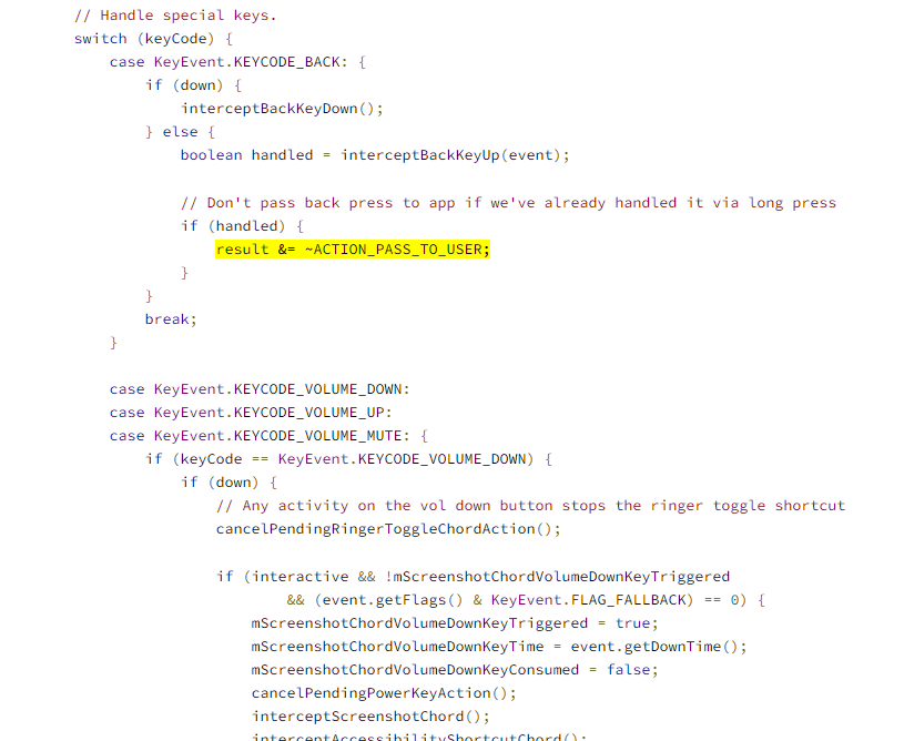 result &= ~ACTION_PASS_TO_USER; 라고 표시하면, 현재 result 에서 ACTION_PASS_TO_USER 표시를 없애는 것이 되므로 해당 key event는 User 즉 app 에서 확인이 불가하게 된다.