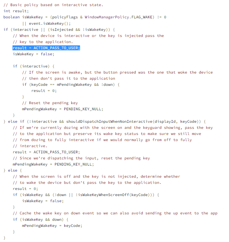 public int interceptKeyBeforeQueueing(KeyEvent event, int policyFlags) 부분을 확인해 보면 아래 쪽에