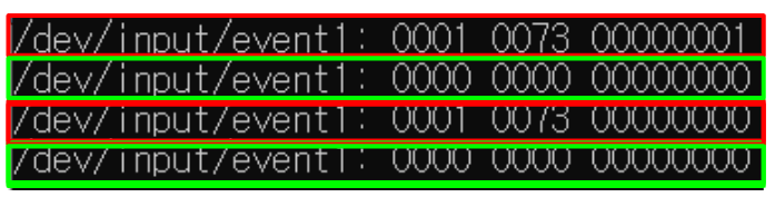 | /dev/input/event1: 0001 0073 00000000 | Key event type : #define EV_KEY 0x01 Key code : 0x0073 (115) Key event : 0x00 (release) |