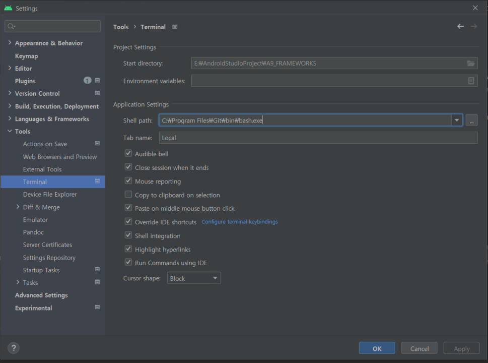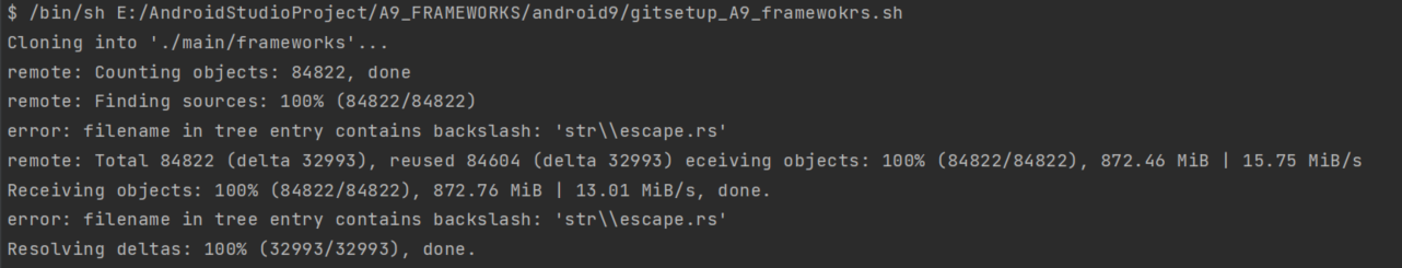 /bin/sh : '/bin/sh' 용어가 cmdlet, 함수, 스크립트 파일 또는 실행할 수 있는 프로그램 이름으로 인식되지 않습니다. 이름이 정확한지 확인하고 경로가 포함된 경우 경로가 올바른지 검증한 다음 다시 시도하십시오. 위치 줄:1 문자:1 + /bin/sh E:/AndroidStudioProject/A9_FRAMEWORKS/android9/gitsetup_A9_fr ... + ~~~~~~~ + CategoryInfo : ObjectNotFound: (/bin/sh:String) [], CommandNotFoundException + FullyQualifiedErrorId : CommandNotFoundException