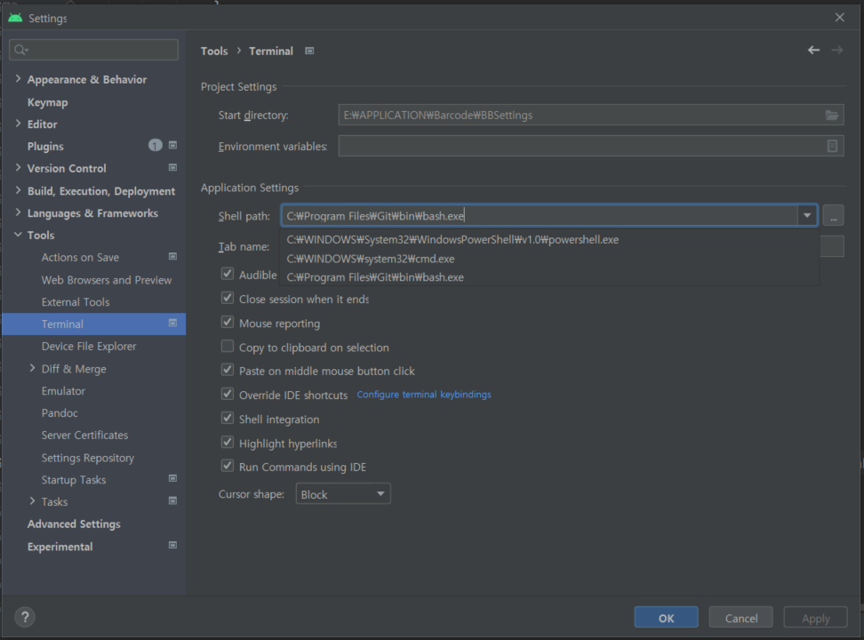 2. Tools > Terminal > Shell path 변경