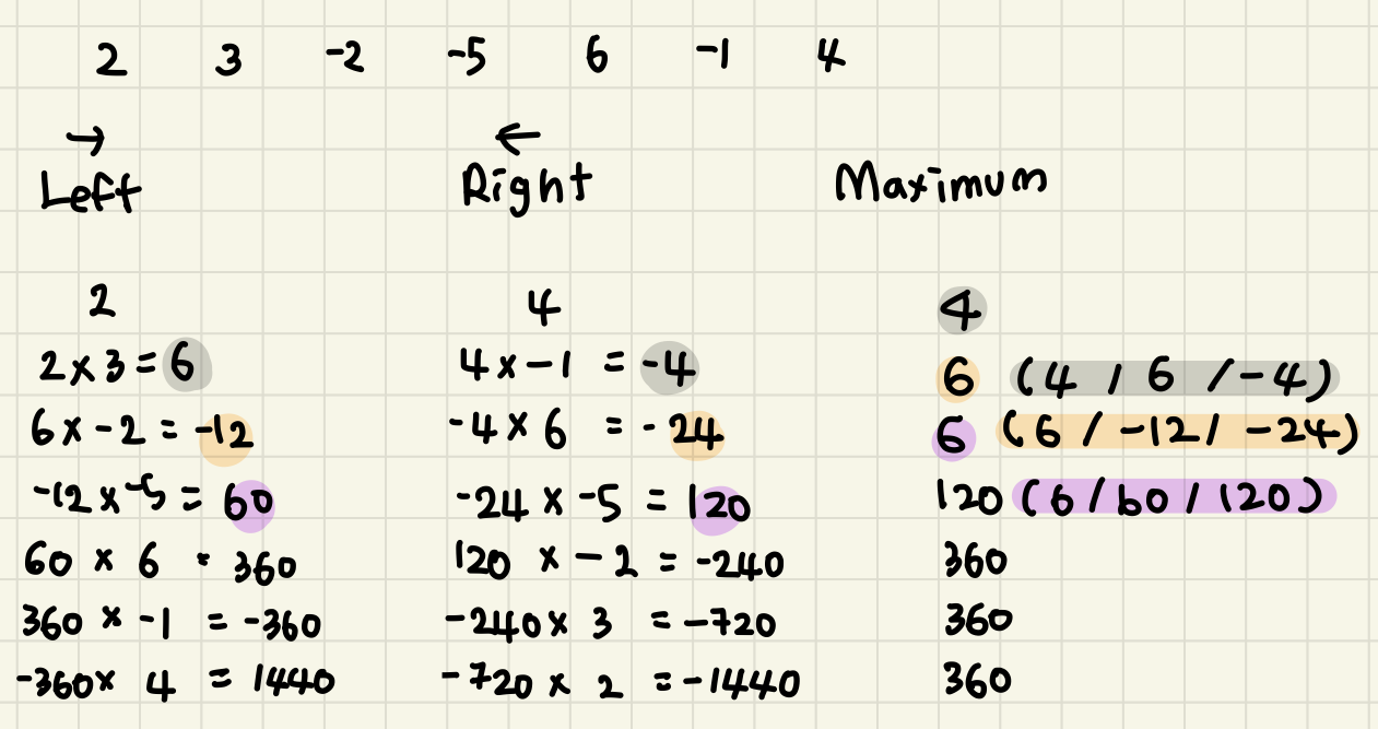 그래서 결국 왼쪽부터 시작한 곱셈 수와 오른쪽 부터 시작한 곱셈 수 중 큰 수를 저장하고 있으면 된다.!!