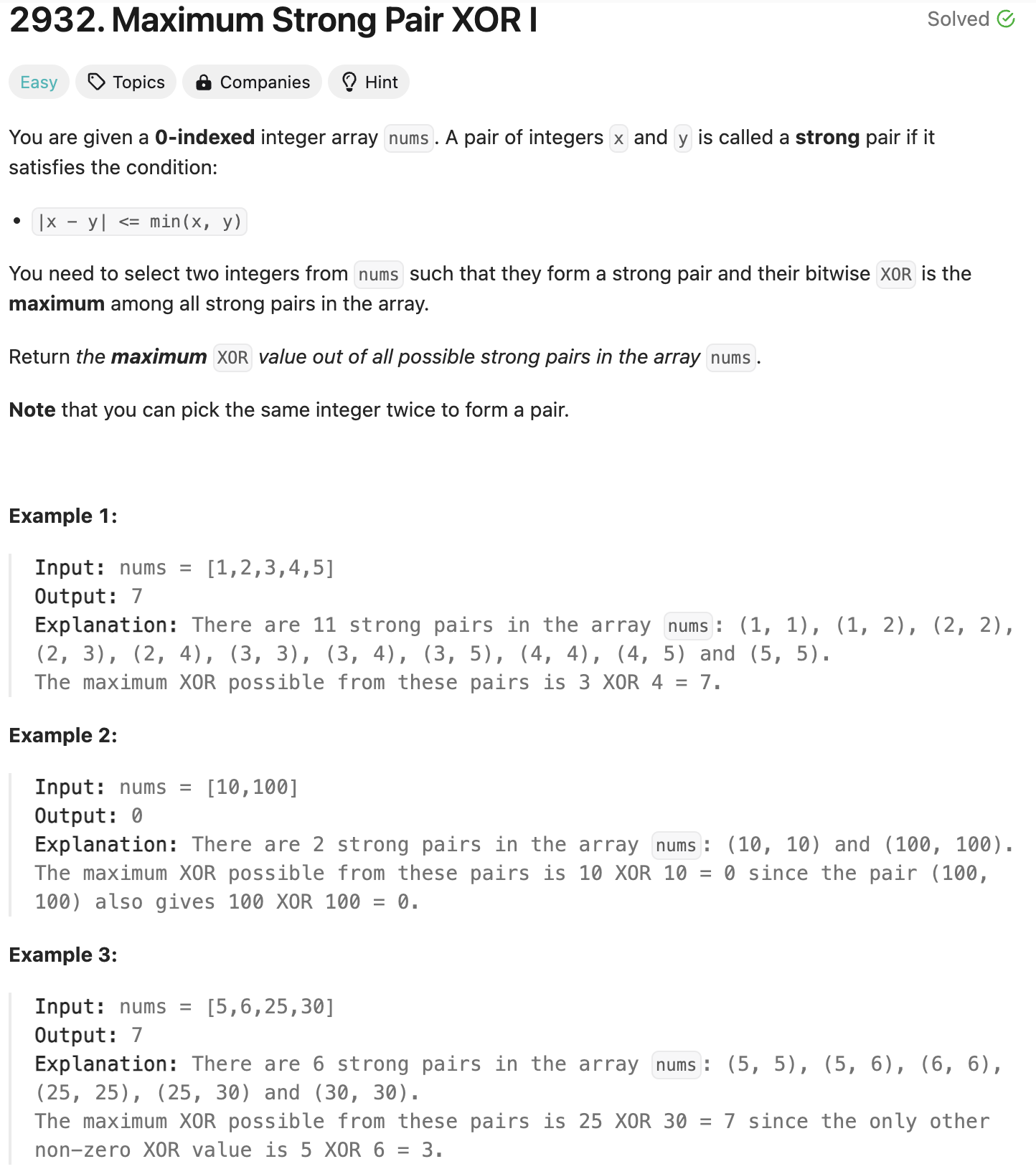 public int maximumStrongPairXor(int[] nums) {