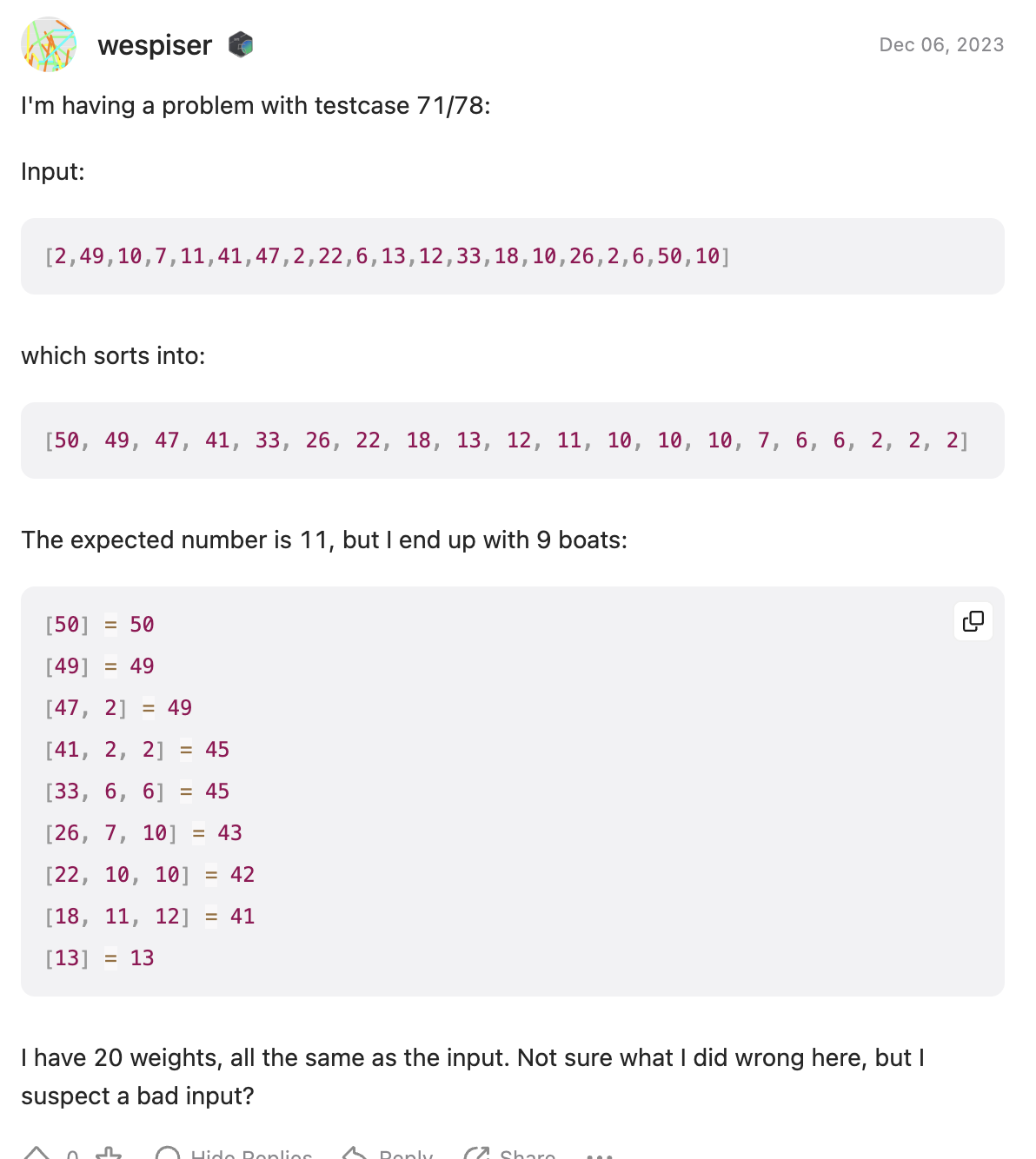 댓글에 2명씩만 타야되는데 너는 지금 3명씩 타고 있는 배가 있잖아~ 라고 해줘서 알았음