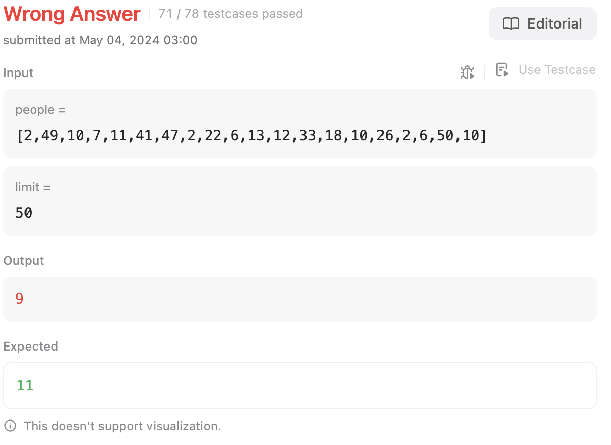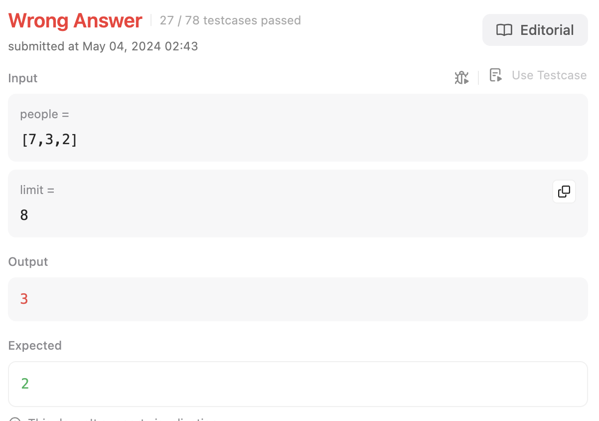 근데 이번에는 2명이 한 배에 탈 수 있는 최대 인원이라는 생각을 못하고 풀었다.
