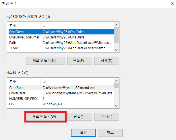 환경 변수 Path 편집에서 새로만들기 > %JAVA_HOMW%\bin; 을 입력해줍니다.