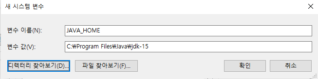 변수 값 : 1번에서 등록한 JDK 경로 (C:\Program Files\Java\jdk-15)