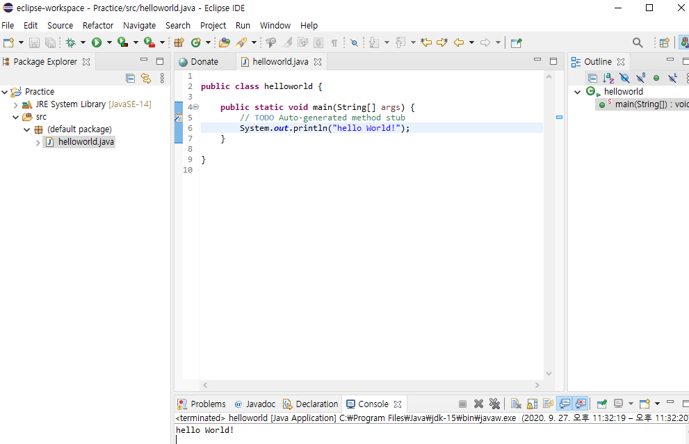 Hello world 를 출력해 보았다.