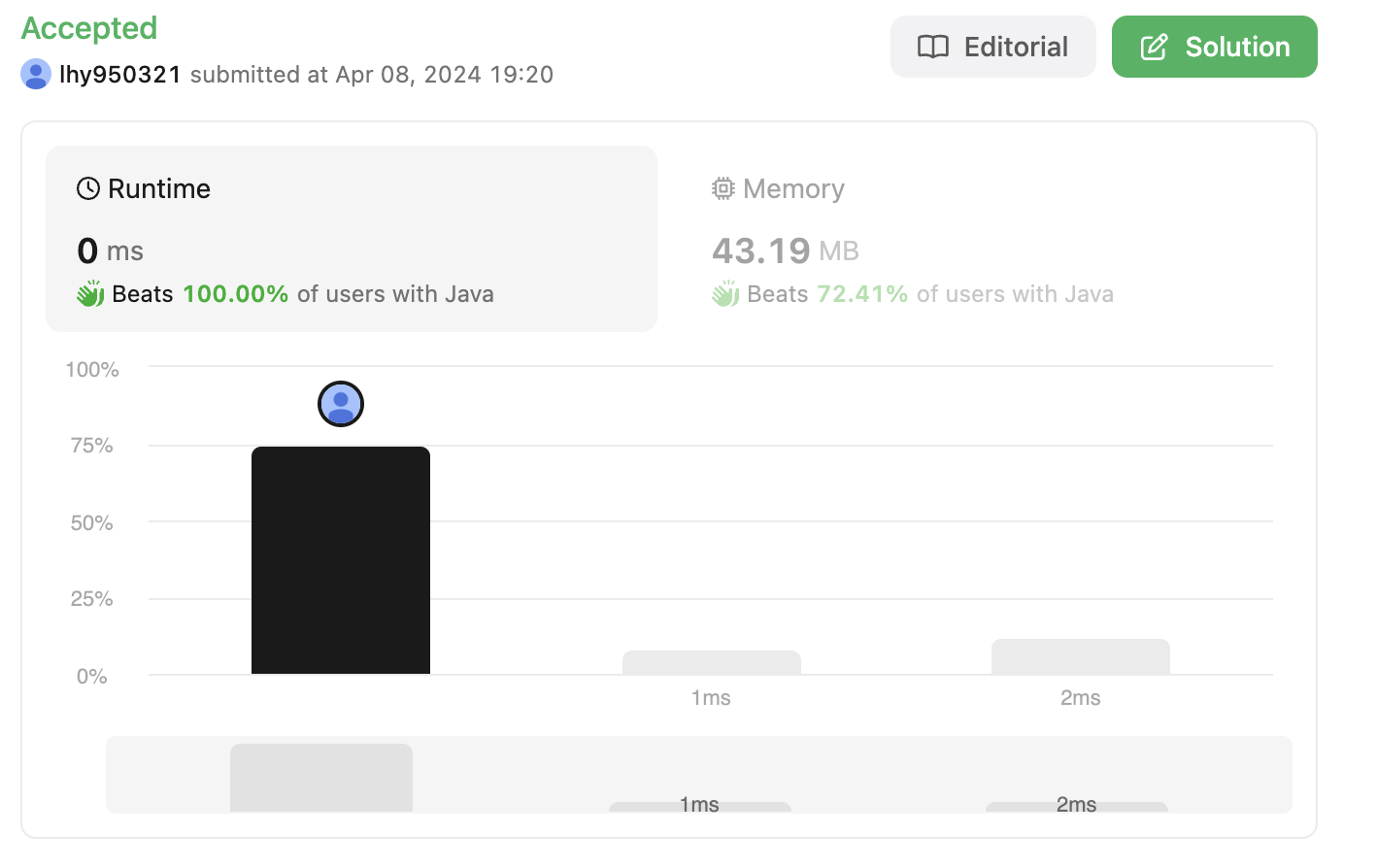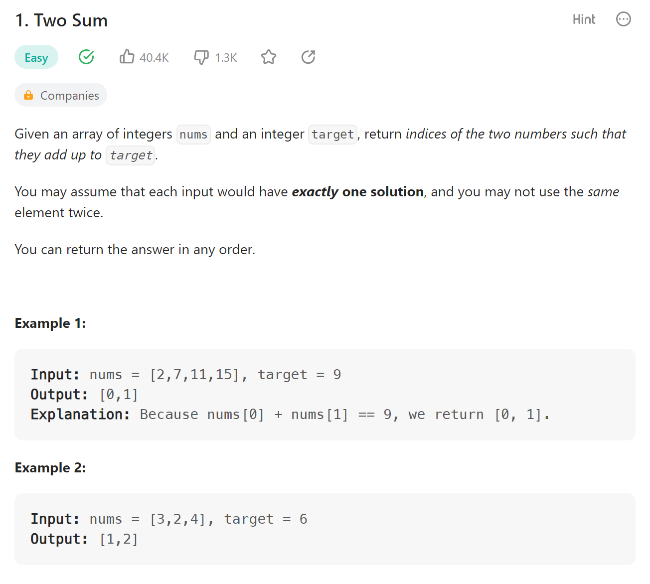 문제 / 예제 / 제한 조건 : 처음에 문제 보자마자 엄청 쉬워보였다.# 풀이 1내가 생각했던 방식은 [1,2,3,4] 가 있다면이 값을 모두 곱해둔 값을 하나 가지고 있고 -> 24result를 저장 할 때, nums[i]로 나누어서 저장하면 된다고 생각했다.class Solution { public int[] productExceptSelf(int[] nums) { int[] results = new int[nums.length]; int allMultipleValue = 1; for (int num : nums) { allMultipleValue *= num; } for (int i = 0; i Time comp..